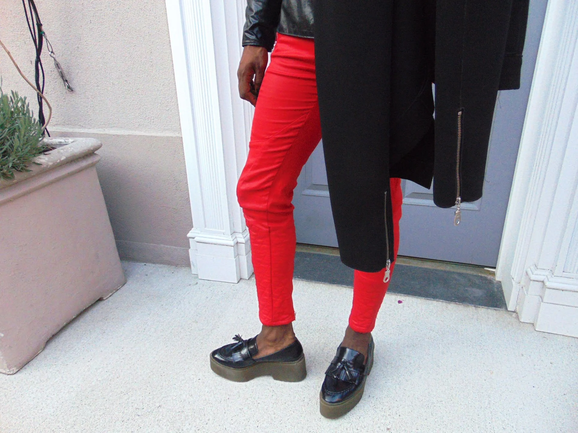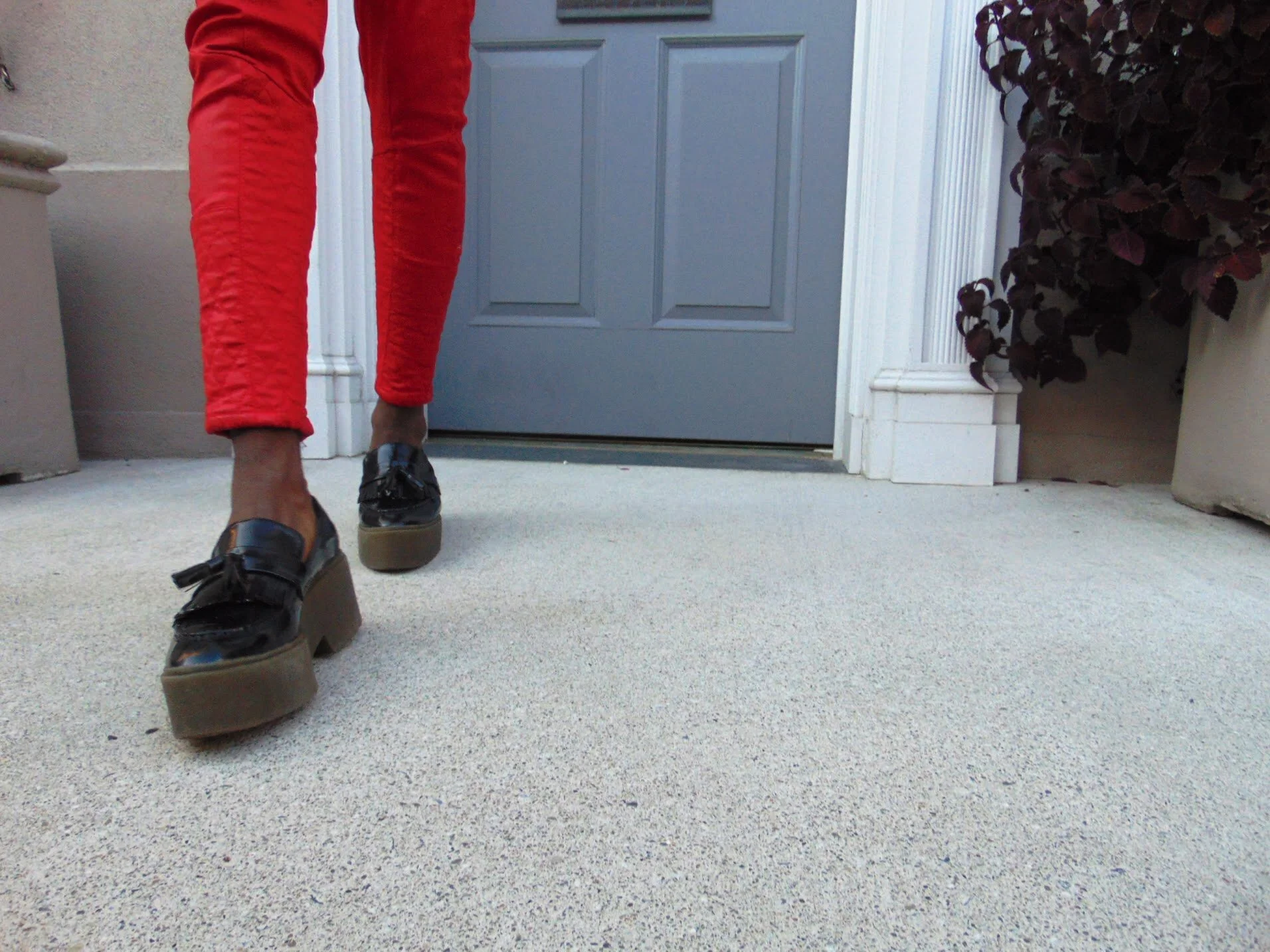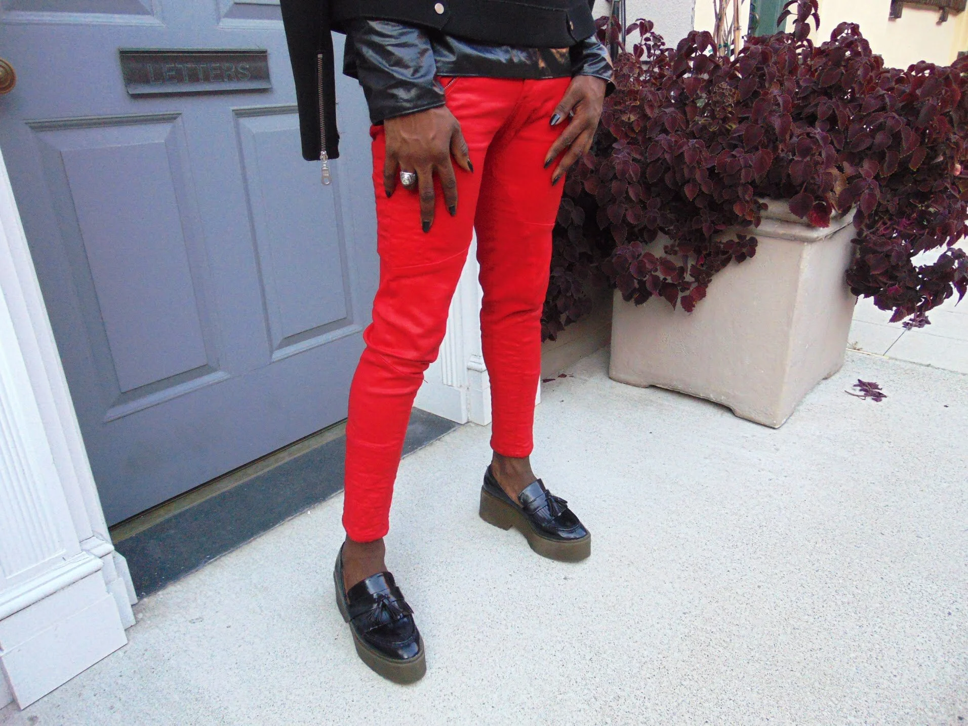 I added a pop of red to turn the firer up on this look with a pair of Penny loafers platforms for some extra inches.