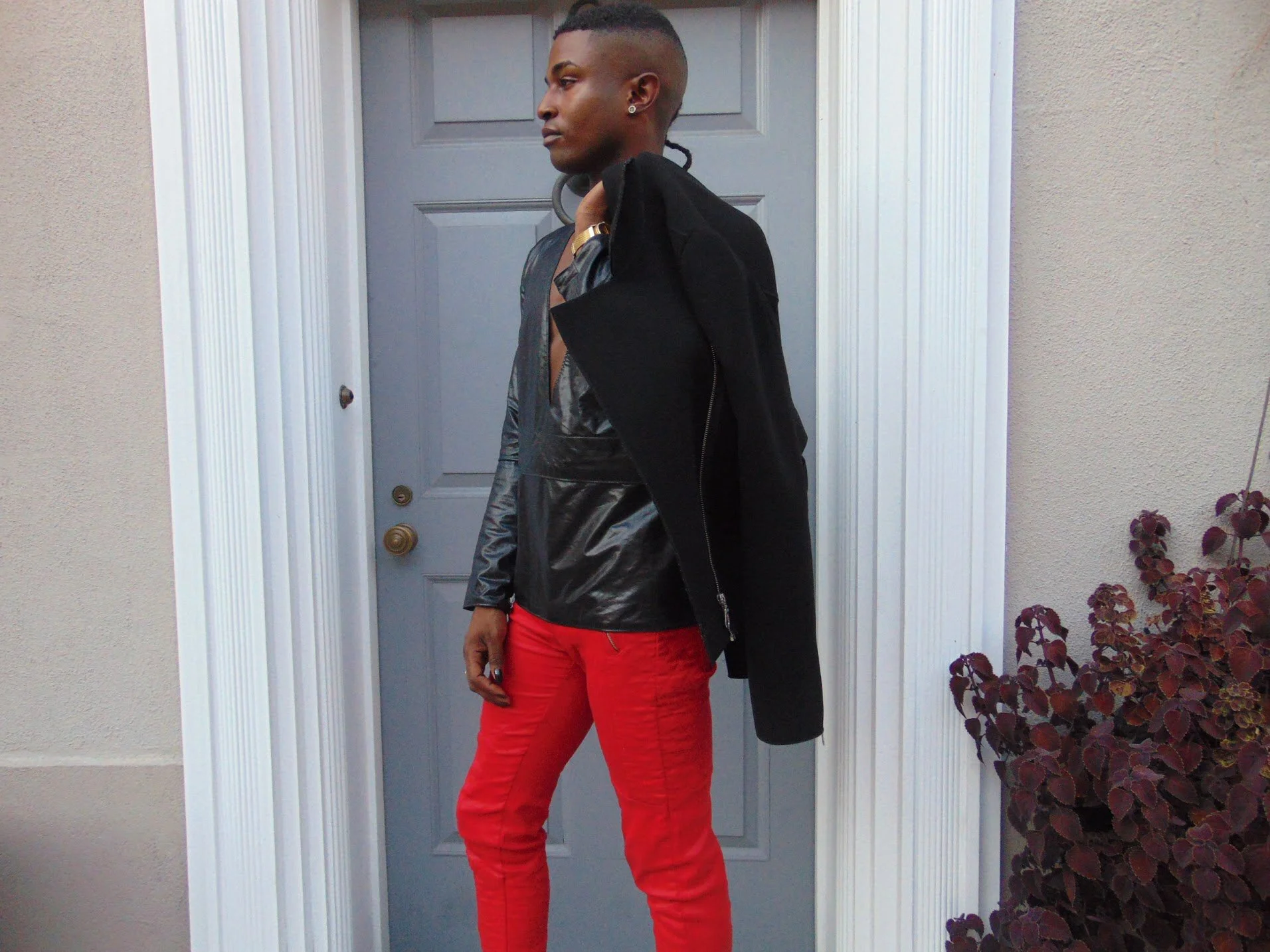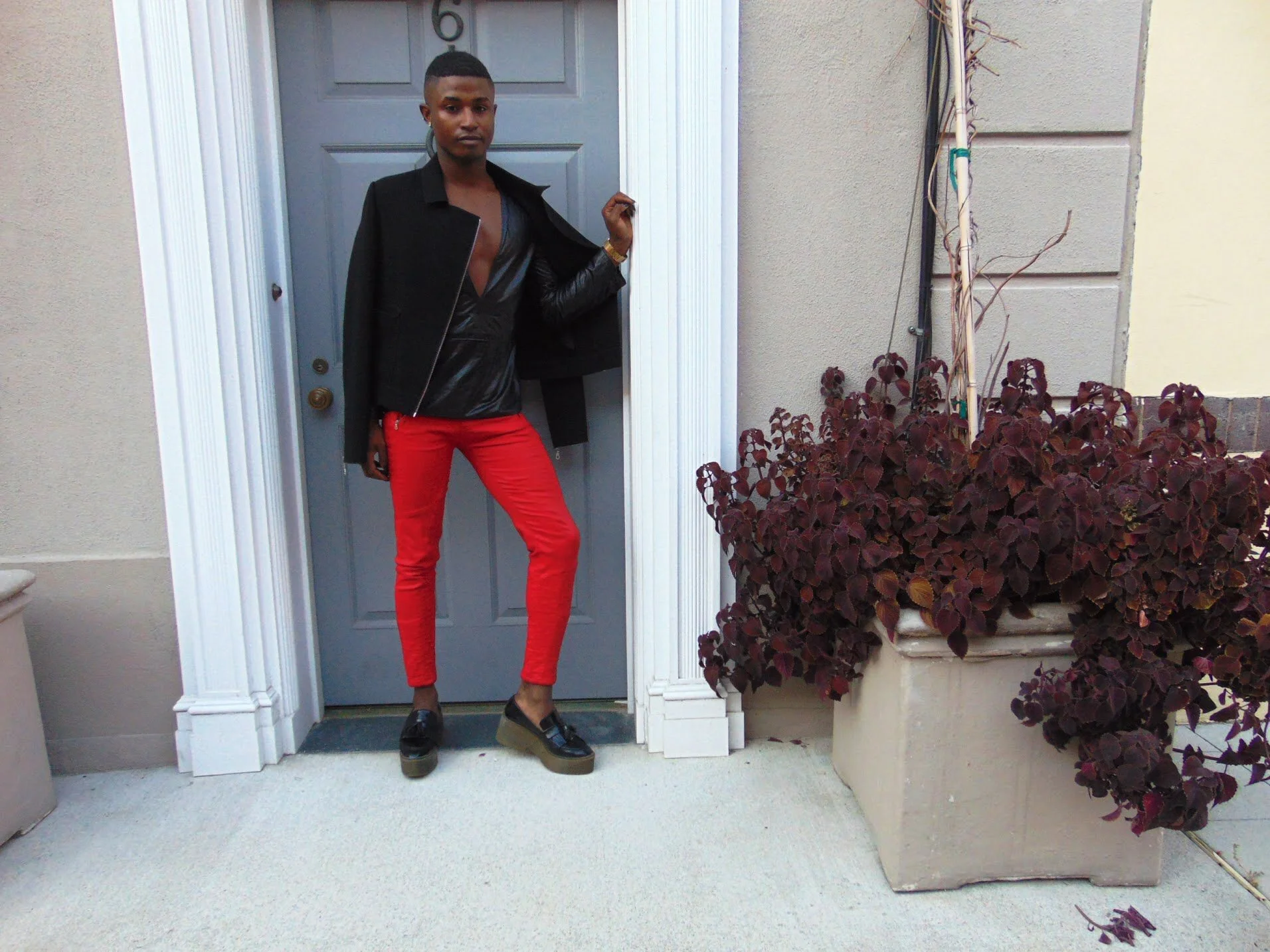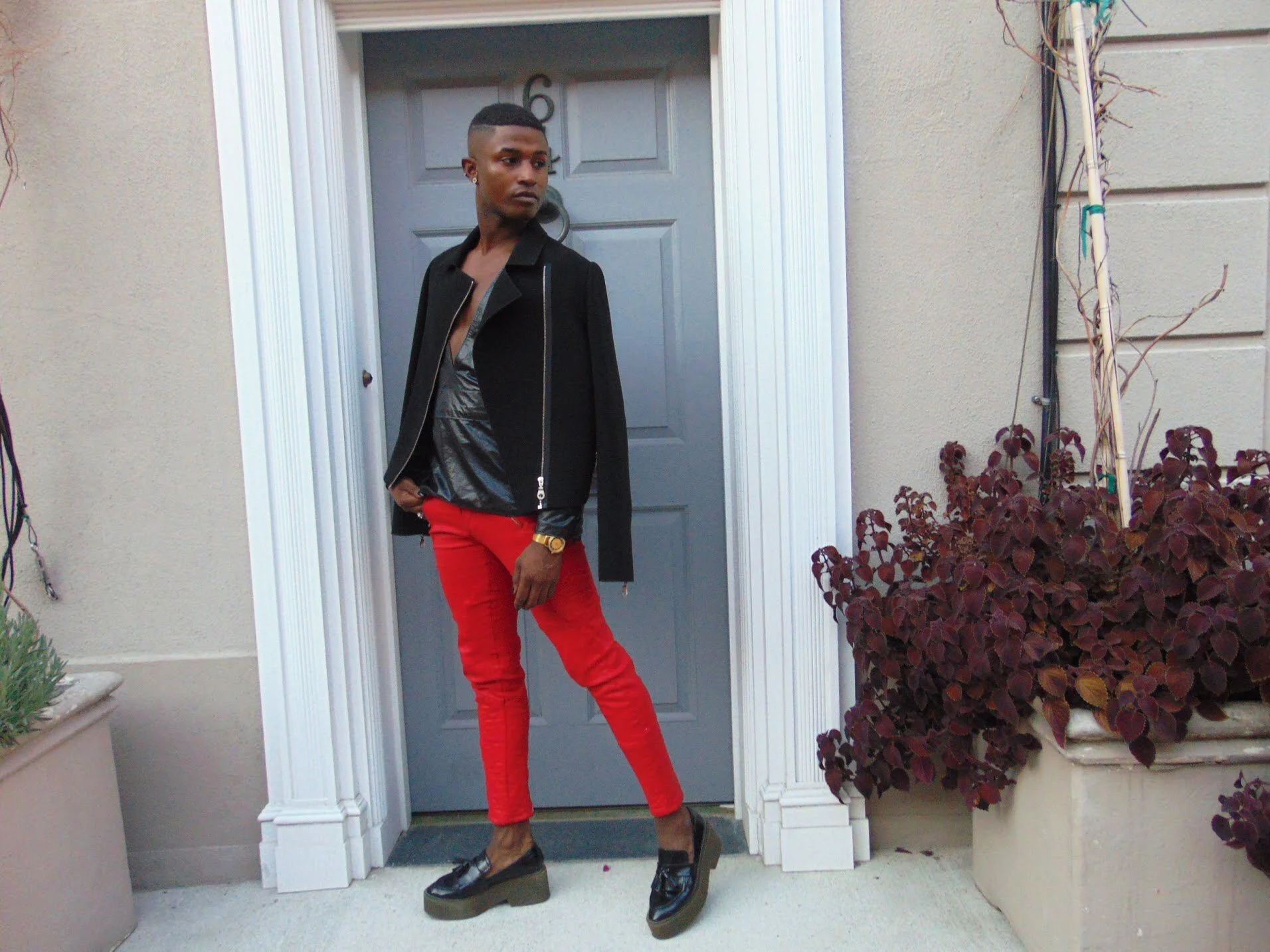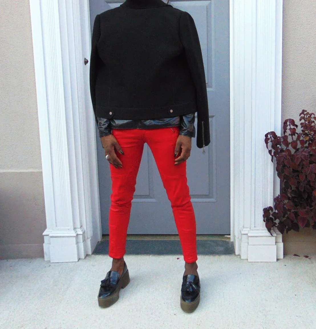 I added a pop of red to turn the firer up on this look with a pair of Penny loafers platforms for some extra inches.