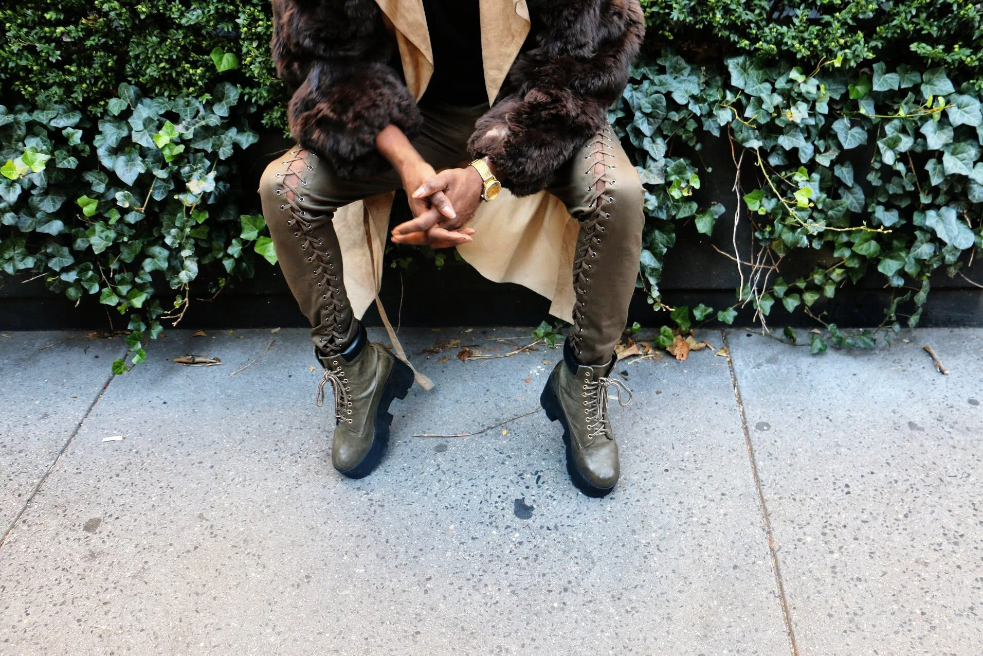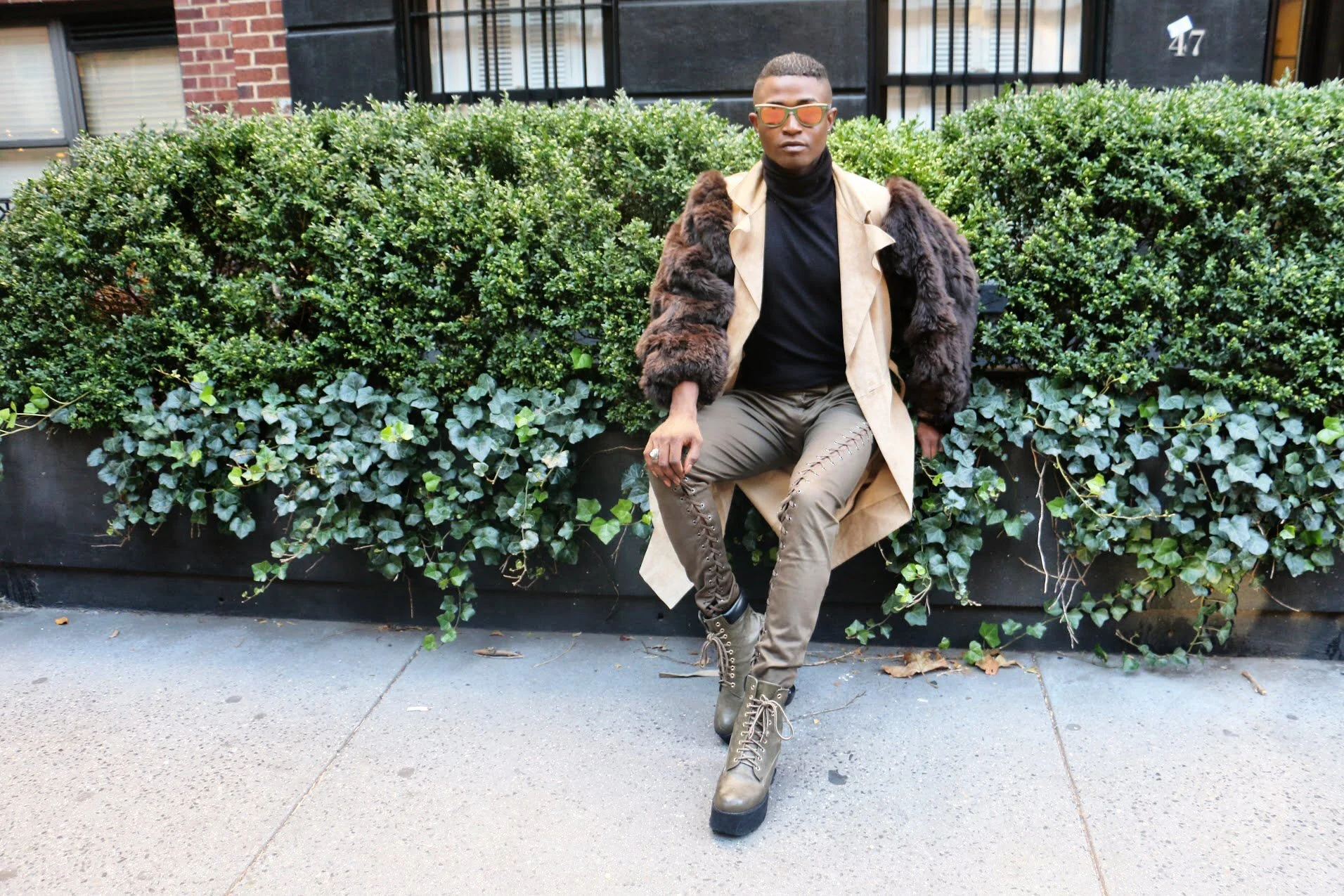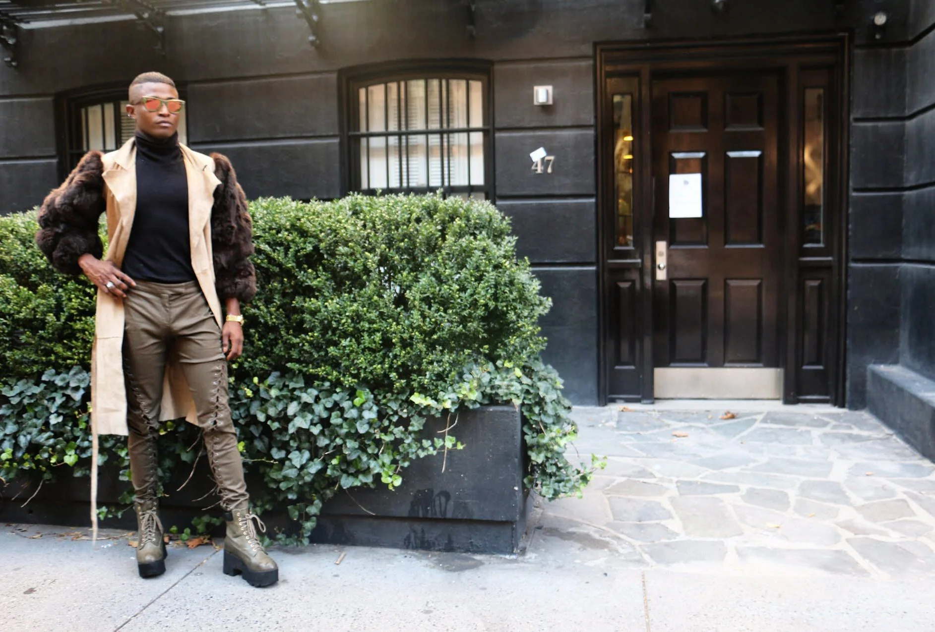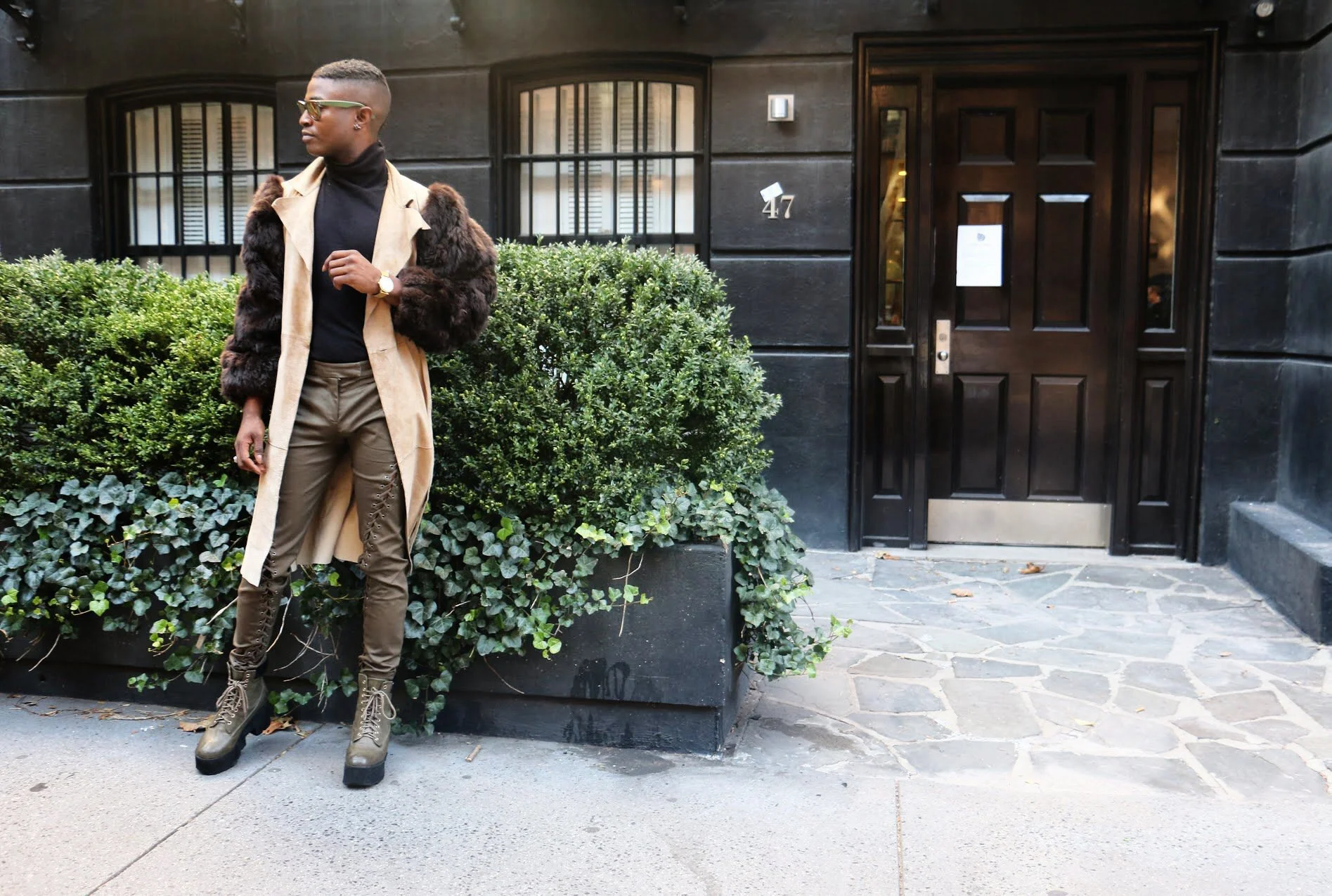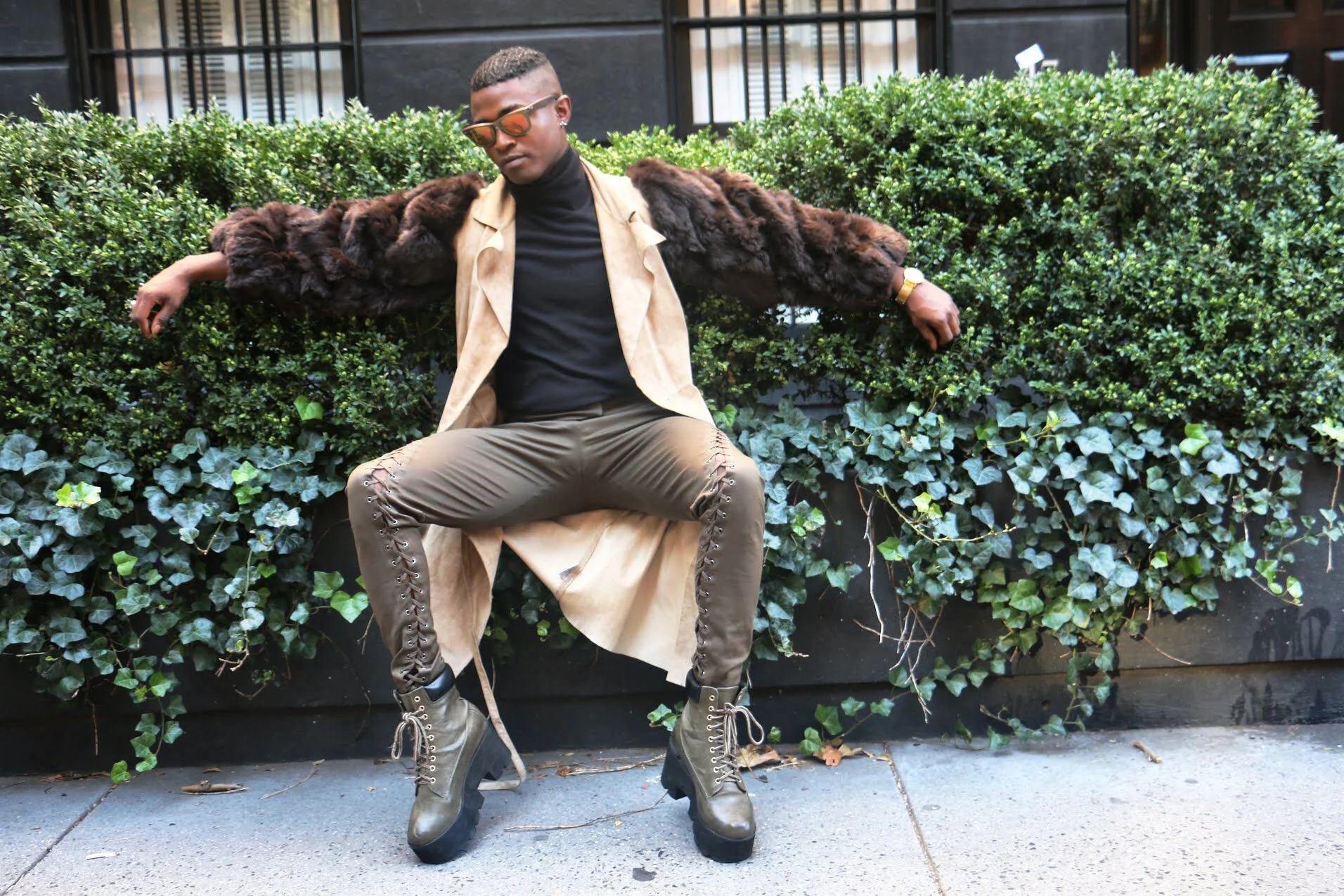 Long coats and fur jackets are great for creating a dramatic look that stands out. I created this look off my fur sleeved trench coat paired with a black turtleneck and army green detail pants accessorized with Venus ray bans to create a balance look. When creating such dramatic looks balance is key.