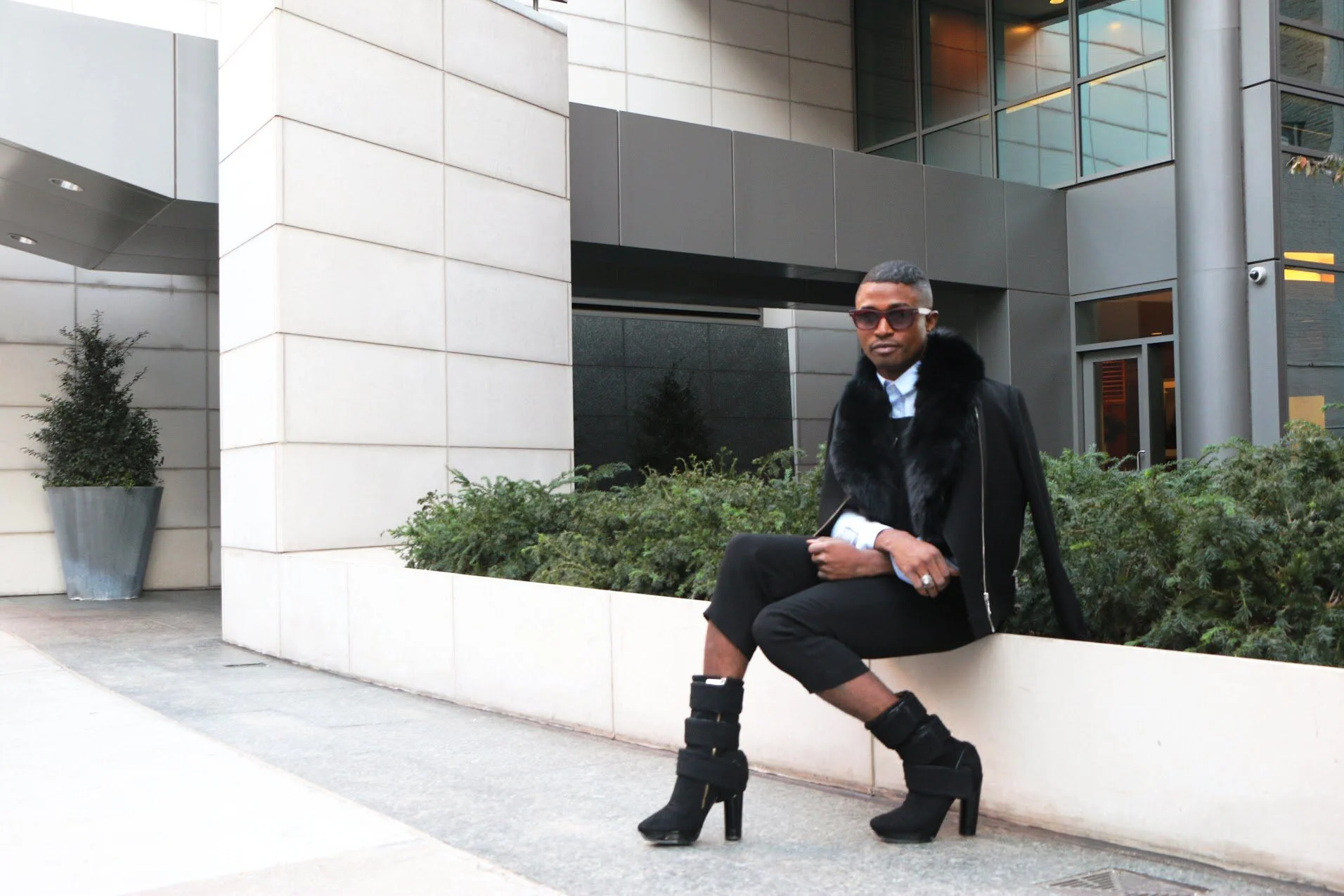 I teamed my black slim leg overalls with a fitted button down and sleek high leg platforms for a more sophisticated feel. This look is easy to wear, comfortable, and works for all occasion. Whether I'm heading to the office,dinner, or the club this look works.