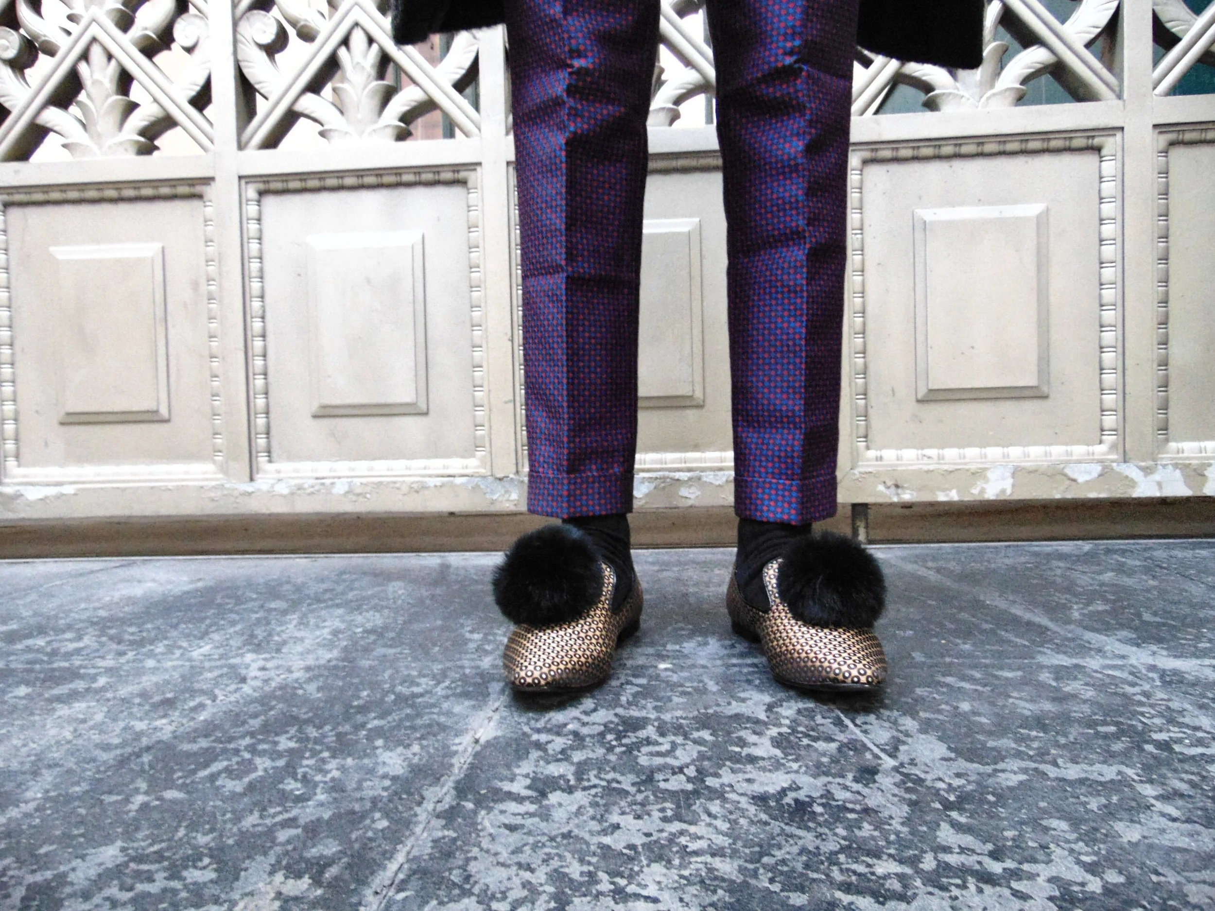Looking sophisticated is not hard to achieve! If there is one fashion staple that everyone must have in there closet, it is the blazer. Blazers are great for transforming your look weather you going for casual or sophistication. With this look, I stuck with a classy sophisticated vibe, mixing a black tailored blazer over a classic white button down combined with straight leg polka dot pants. To top the look off, I paired black and gold jacquard textile slippers with larger Pom Pom detailing which adds a change of character to the rest of my look.