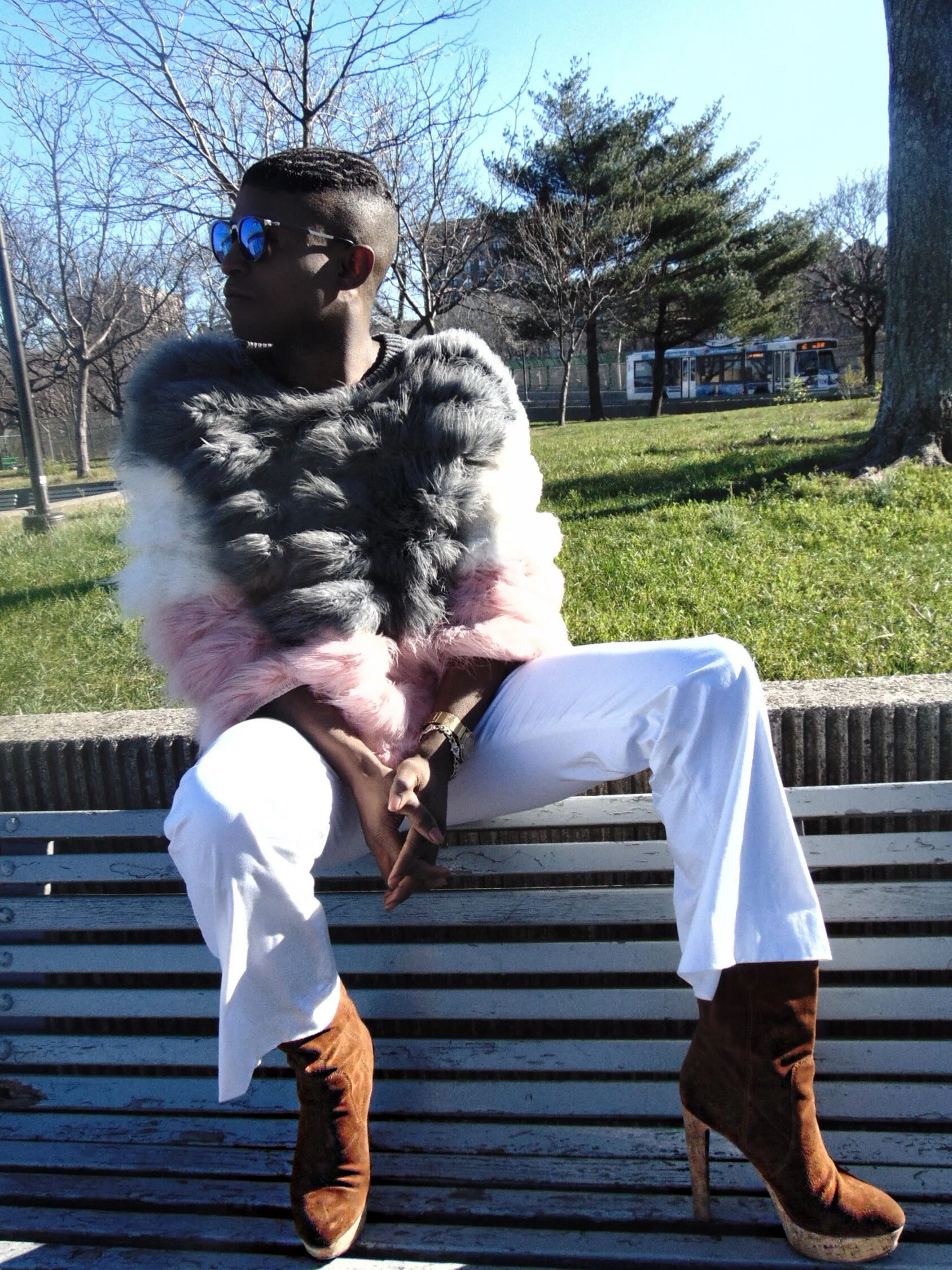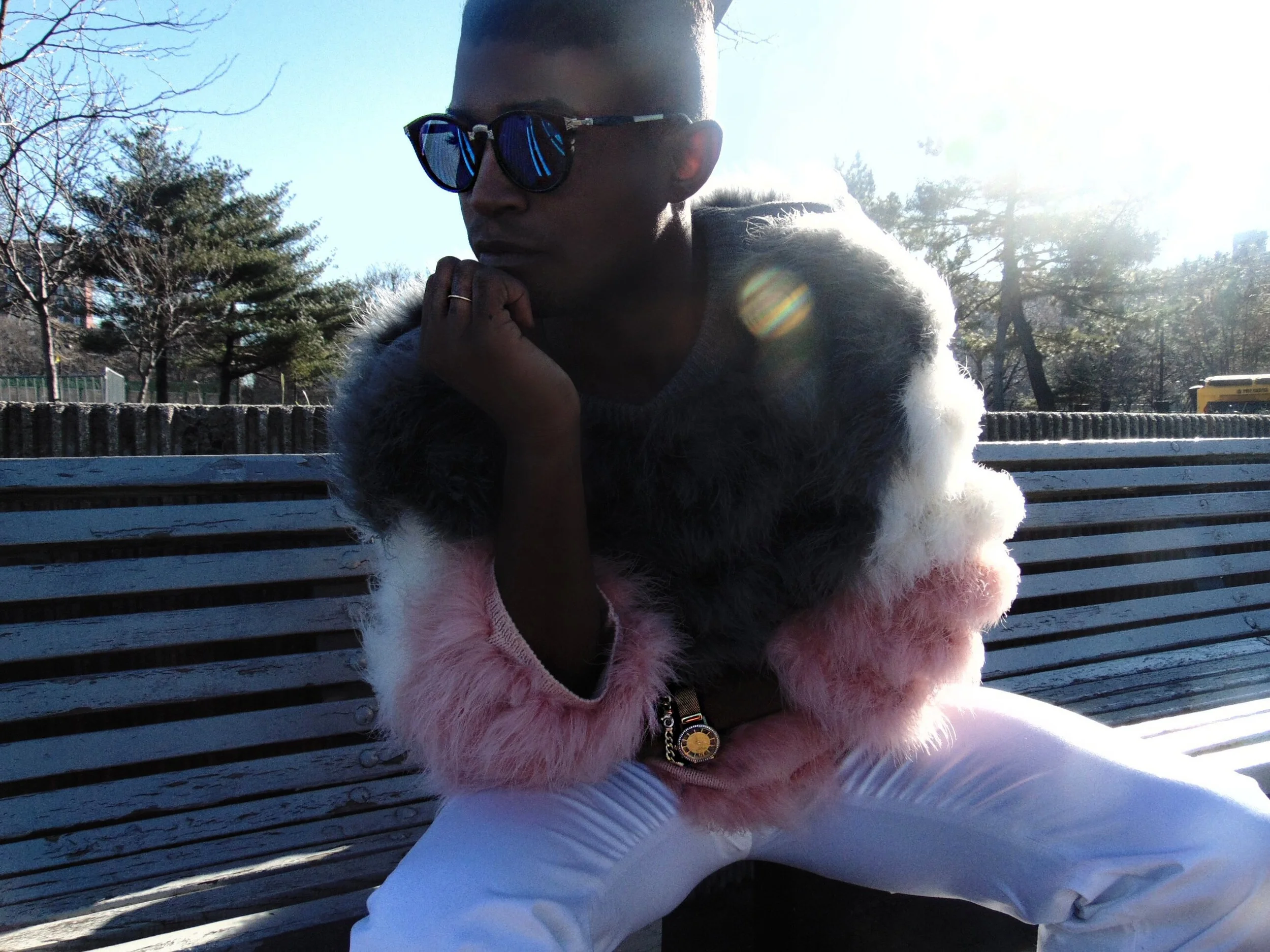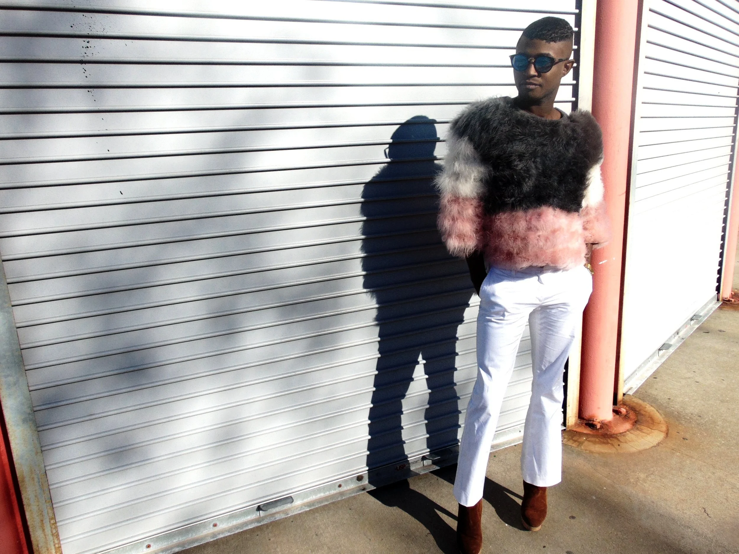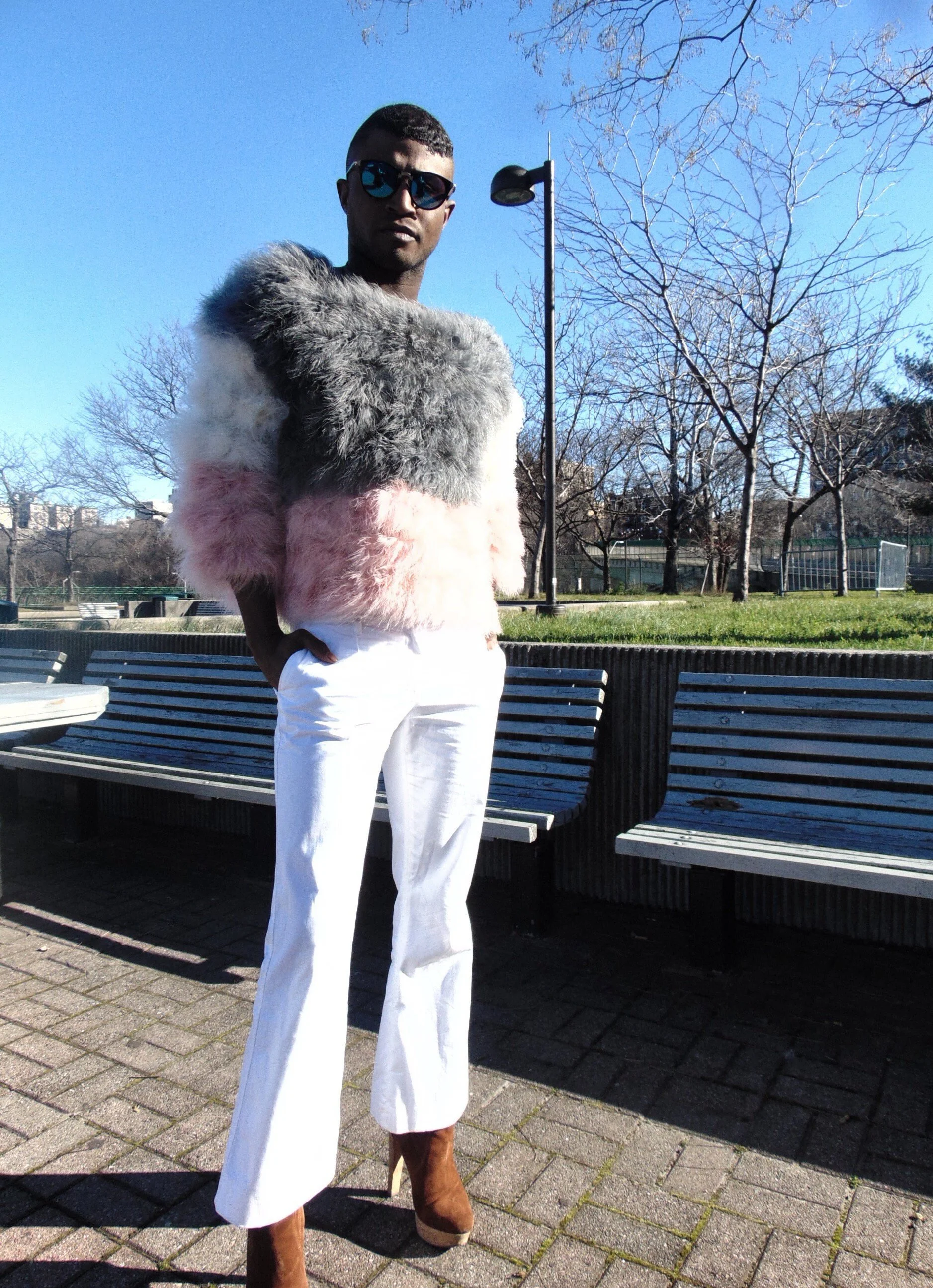 Every New Yorker I know wear black on black in the winter. I'm not saying anything is wrong with it but we should take risks by adding a little color into our winter looks this season. It's away to produce authentic trends for yourself and others. With this androgynous outfit, I paired a multi color feather fur crop sweater with white wide leg trouser from Dolce and Gabbana. To top the look off, I added blue mirror sunglasses by WILDFOX and tan boots to add more flavor to the color blocking in this look. When ever you creating a new look, visualize what you see in your mind, and create original meaning to your style.